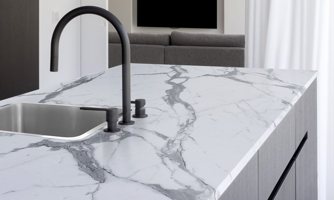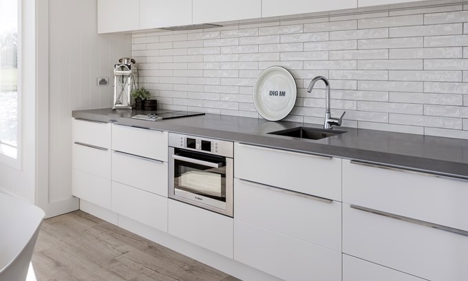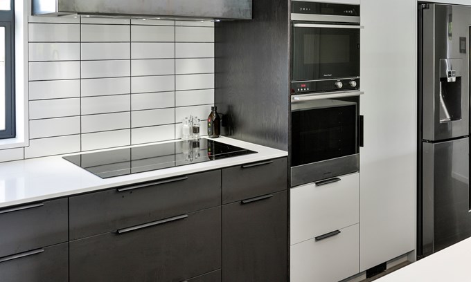 Soft-matt laminates combine for this easy-care stylish kitchen